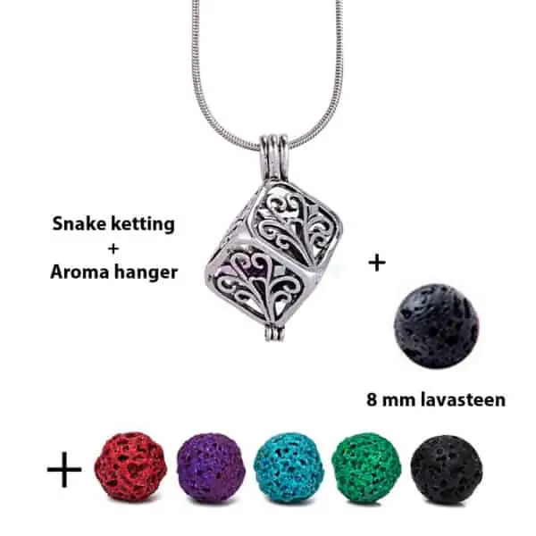 Heerlijke geurketting parfumhanger vintage dobbelsteen lavasteen, een snake ketting +- 70cm – 28 inch met parfum geur medaillon inclusief 5 gekleurde lava stenen 8mm in diverse kleuren om parfum of essentiële olie op te doen. Een Diffuser aroma ketting uit de essential oils aromatherapie collectie. Dit medaillon is dobbelsteen vormig en heeft een diameter van +- 16 mm.