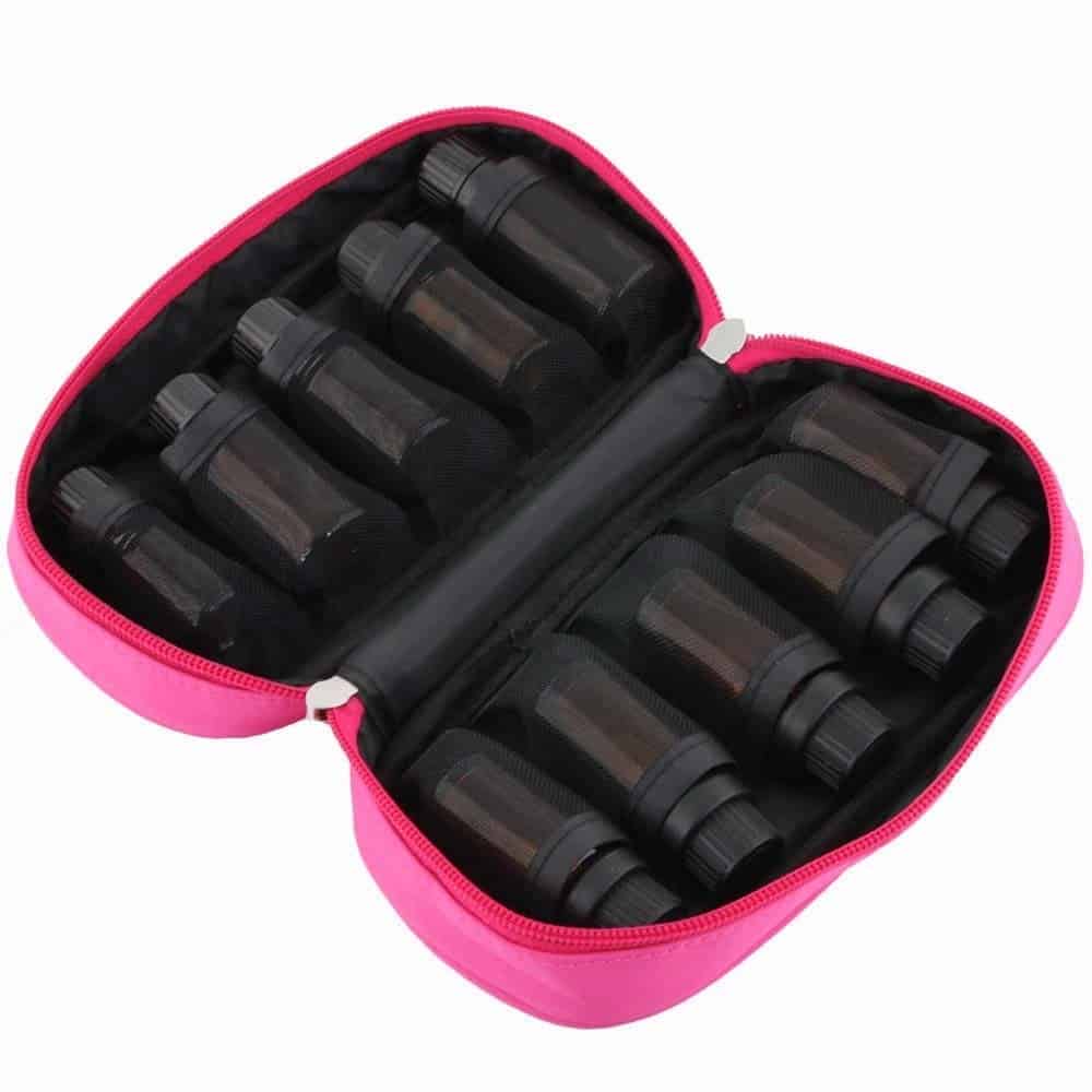 Totaal kunnen er 10 olieflesjes / parfumflesjes in deze handige reisetui mee op reis genomen worden. De reistas met rits is in verschillende kleuren leverbaar.