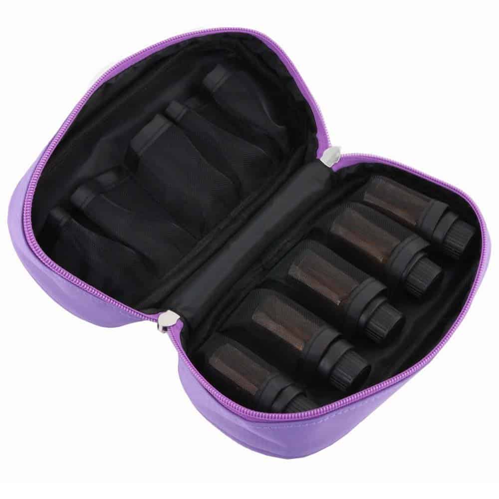 Plaats de essentiële olie flesjes in de speciaal daarvoor bestemde houders met gaas en bandjes binnen in deze etui, en de glazen flesjes blijven veilig op zijn plaats en zijn beschermd tegen botsen en licht.